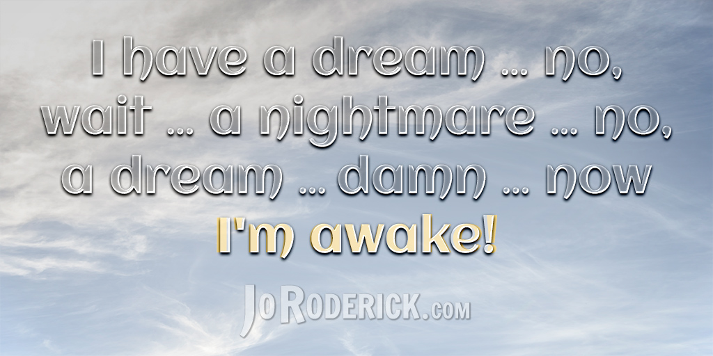 Quote 016: I have a dream … no, wait … a nightmare … no, a dream … damn … now I’m awake! Join me on: JoRoderick.com | Facebook | Twitter