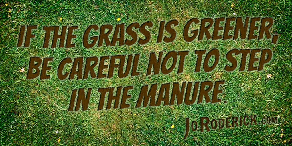 Quote 027: If the grass is greener, be careful not to step in the manure. Join me on: JoRoderick.com | Facebook | Twitter