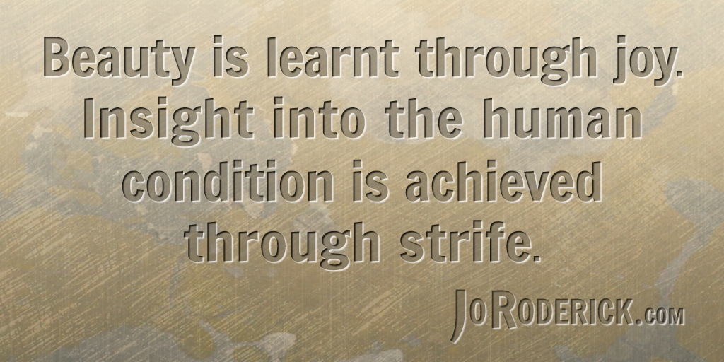 Quote 030: Beauty is learnt through joy. Insight into the human condition is achieved through strife. Join me on: JoRoderick.com | Facebook | Twitter
