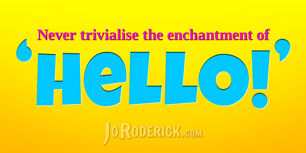 Quote 048: Never trivialise the enchantment of ‘hello’. It can accomplish great feats. Join me on: JoRoderick.com | Facebook | Twitter