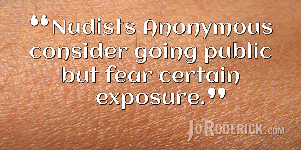 Quote 022: Nudists Anonymous by Jo Roderick · Published 2015/11/07 · Updated 2017/02/11 Quote 022: Nudists Anonymous consider going public but fear certain exposure. Join me on: JoRoderick.com | Facebook | Twitter