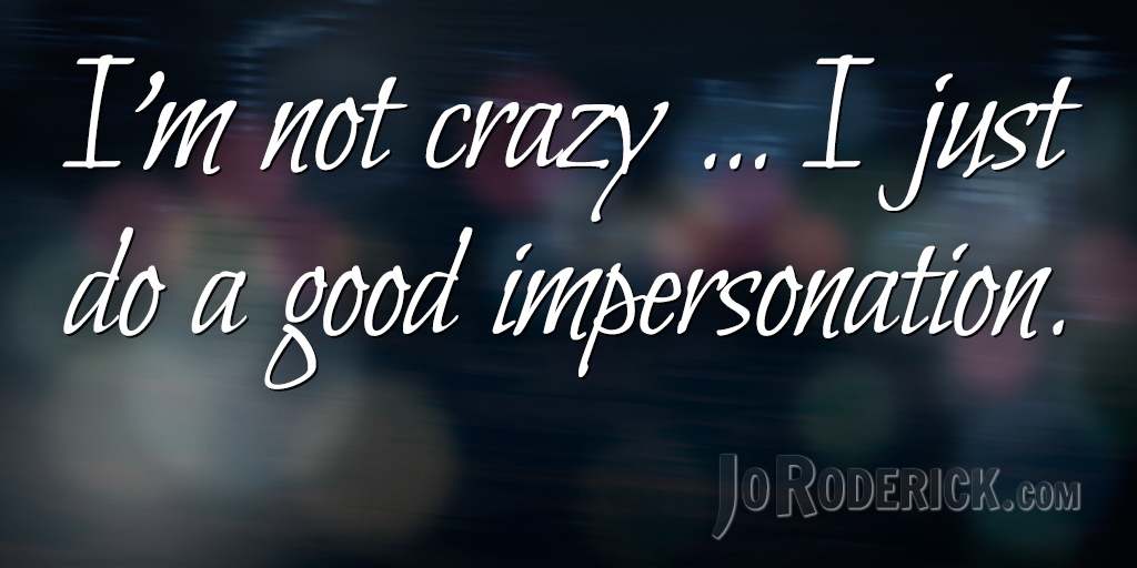 Quote 023: I’m Not Crazy by Jo Roderick · Published 2015/11/08 · Updated 2017/02/11 Quote 023: I’m not crazy … I just do a good impersonation. Join me on: JoRoderick.com | Facebook | Twitter