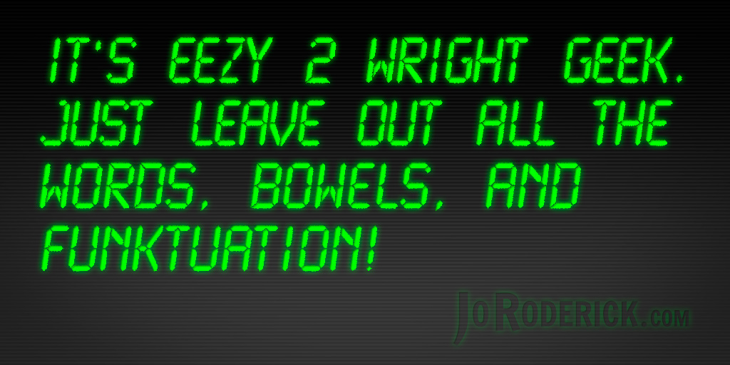 Quote 109: It’s eezy 2 wright geek. Just leave out all the words, bowels, and funktuation! Join me on: JoRoderick.com | Facebook | Twitter